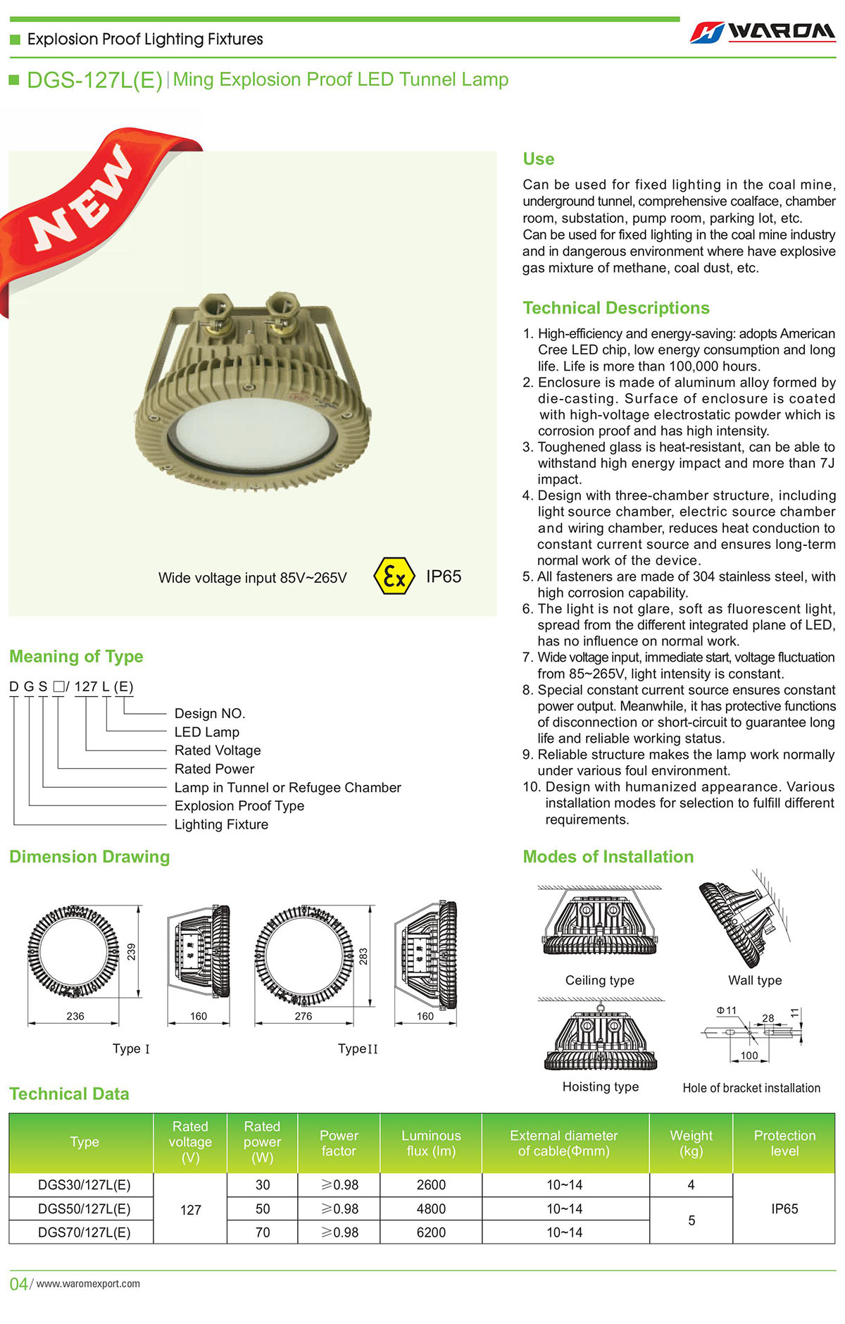 Use: Can be used for fixed lighting in the coal mine, Can be used in flammable and explosive, various underground tunnel, comprehensive coalface, chamber indoor and outdoor locations, important camera room, substation, pump room, parking lot, etc. monitoring area, sites of construction or locations Can be used for fixed lighting in the coal mine industry with facilities and devices. and in dangerous environment where have explosive gas mixture of methane, coal dust, etc
