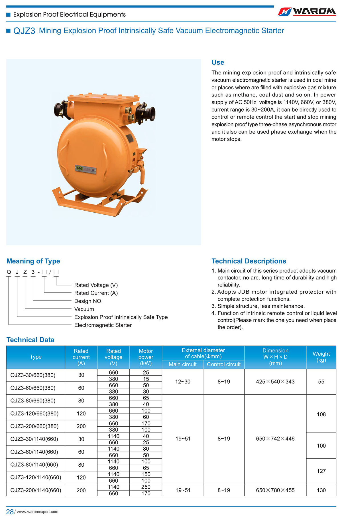 Use: The mining explosion proof and intrinsically safe vacuum electromagnetic starter is used in coal mine or places where are filled with explosive gas mixture such as methane, coal dust and so on. In power supply of AC 50Hz,voltage is 1140V, 660V, or 380V, current range is 30~200A,it can be directly used to control or remote control the start and stop mining explosion proof type three-phase asynchronous motor and it also can be used phase exchange when the motor stops.