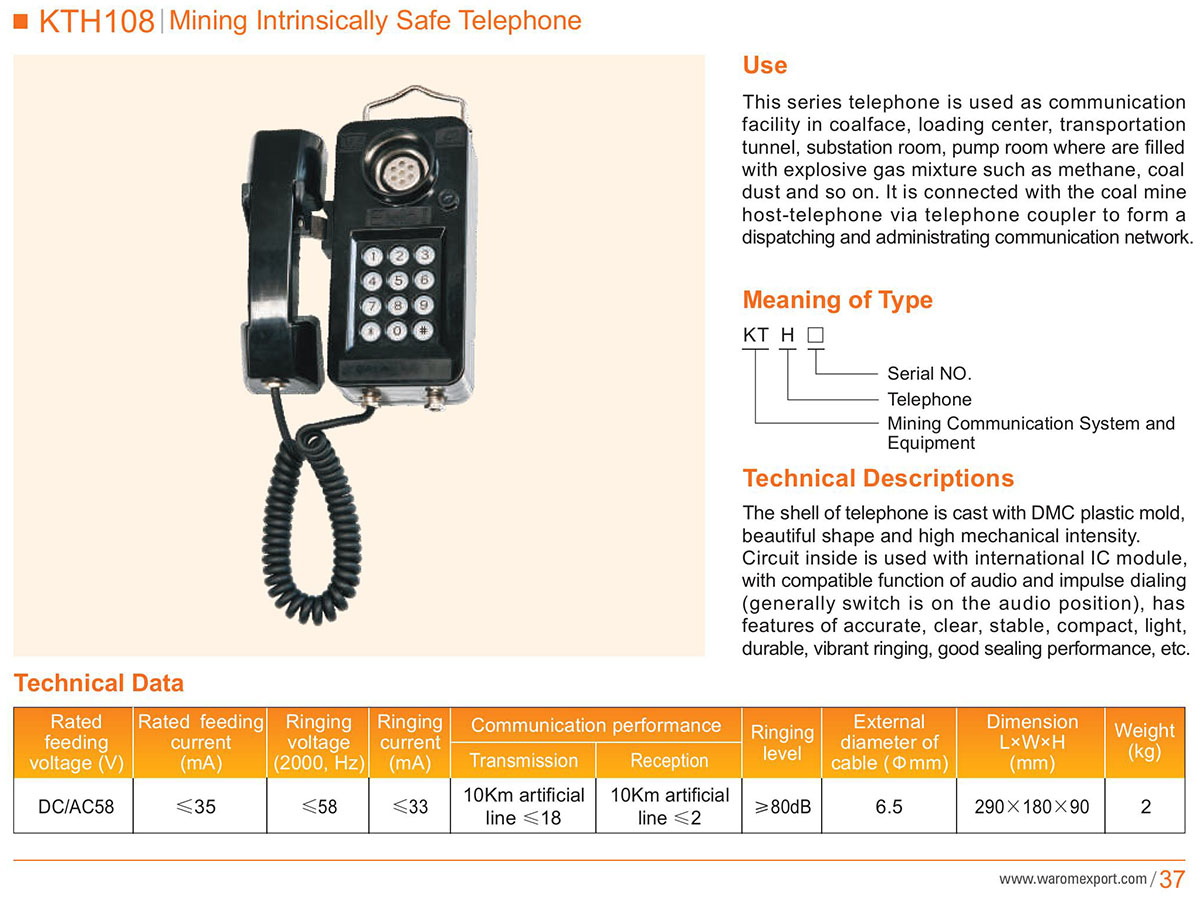Use: This series telephone is used as communication facility in coalface, loading center,transportation tunnel, substation room, pump room where are filled with explosive gas mixture such as methane, coal dust and so on. It is connected with the coal mine host-telephone via telephone coupler to form a dispatching and administrating communication network.