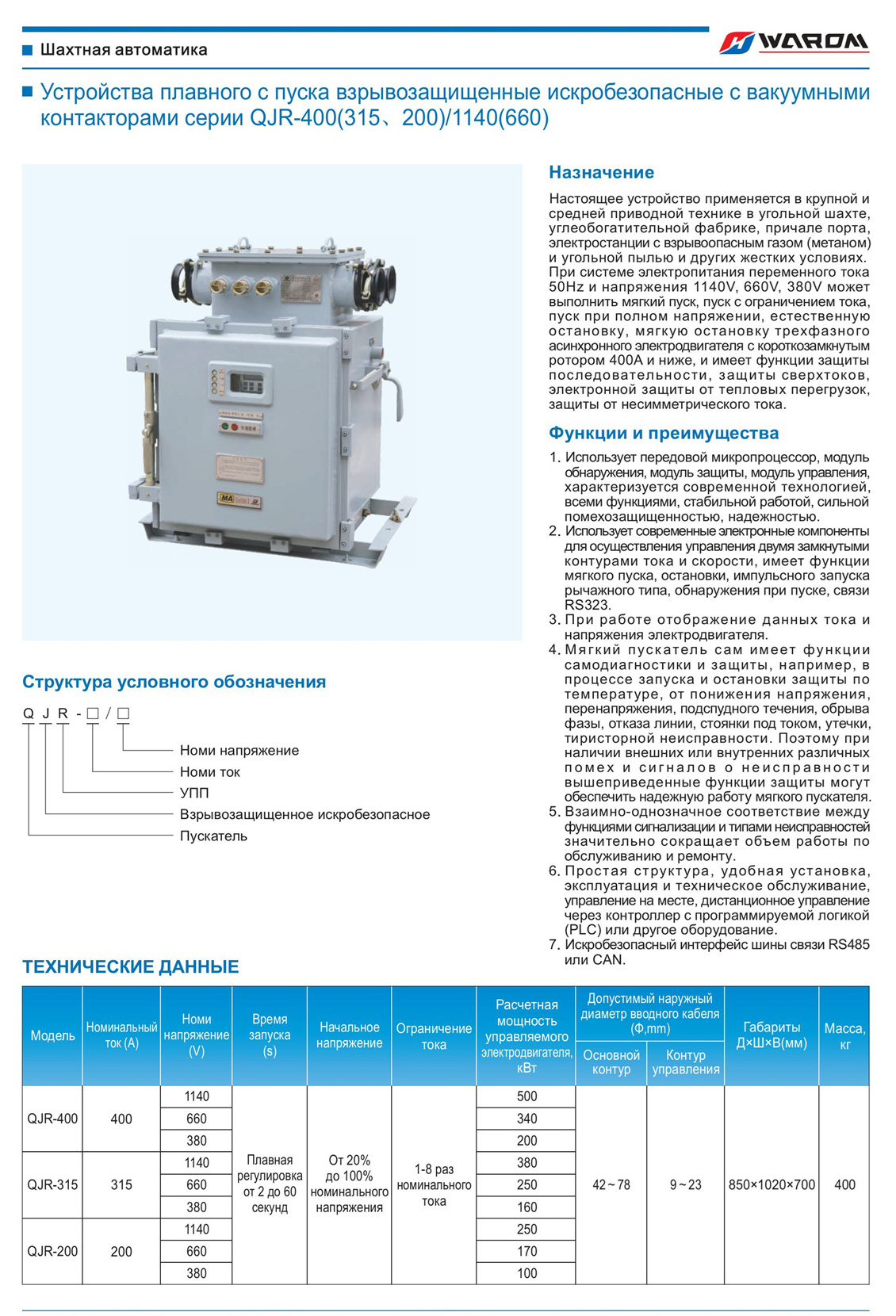 Устройства плавного с пуска взрывозащищенные искробезопасные с вакуумными контакторами серии QJR-400(315、200)/1140(660)